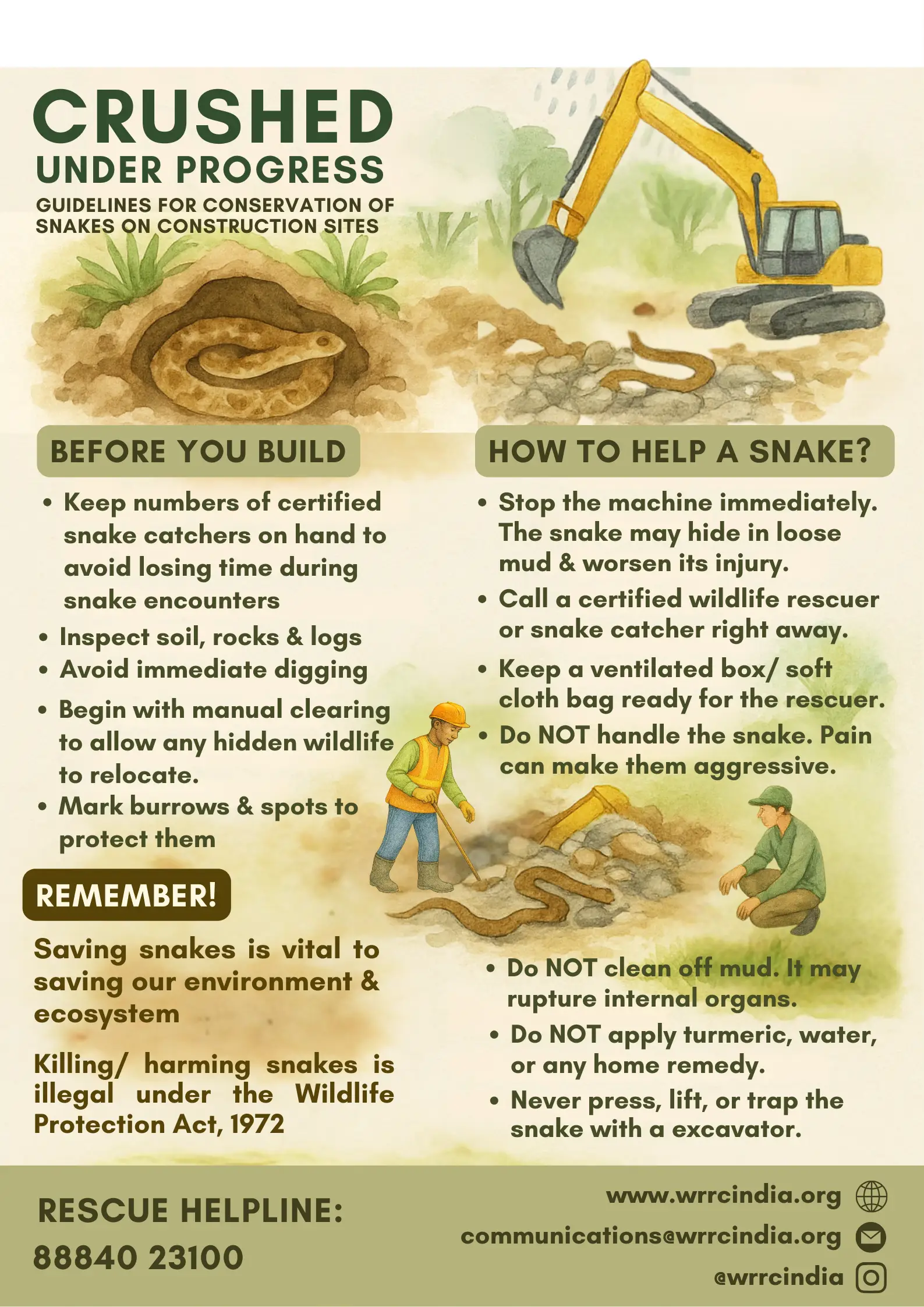 It clarifies what urban wildlife is and their essential role in ecosystems, such as pollination by birds and bees and tree planting by squirrels. The document offers guidance for harmonious living through tips like observing from afar, creating animal-friendly homes, and fostering wildlife-friendly gardens. It debunks common myths about snakes, emphasizing their role as pest controllers and environmental indicators, and encourages a positive attitude towards them. Additionally, it provides crucial “dos and don’ts” for snake bites and outlines safe practices for rescuing injured birds and other animals, highlighting the importance of professional help. Interactive activities like puzzles and “spot the difference” engage readers and reinforce learning about various species. The document also lists emergency contact numbers for wildlife rescue organizations, ensuring people know who to call for assistance. Ultimately, its goal is to educate the public, especially younger individuals, on the importance of urban wildlife and responsible interaction.